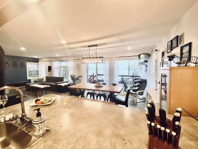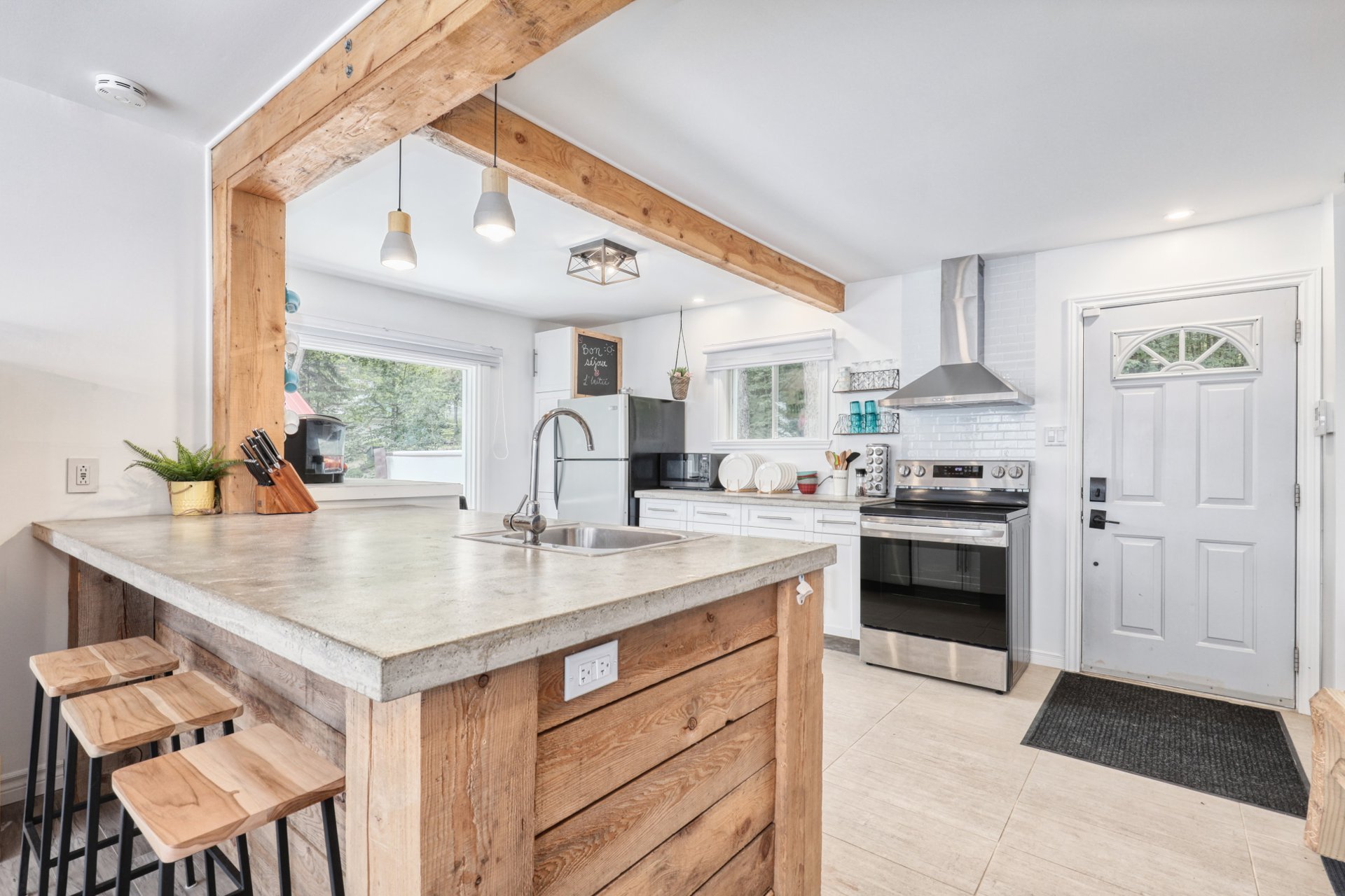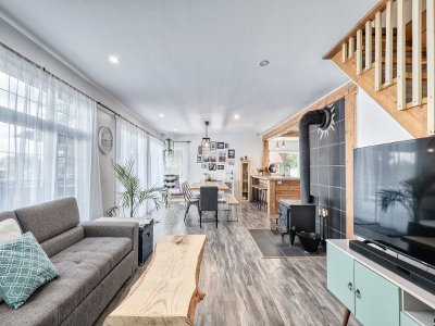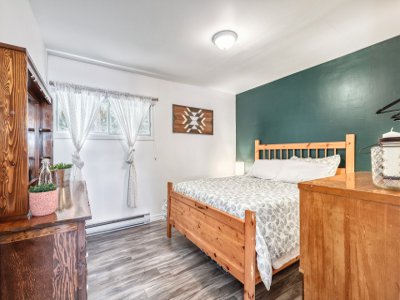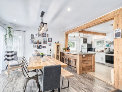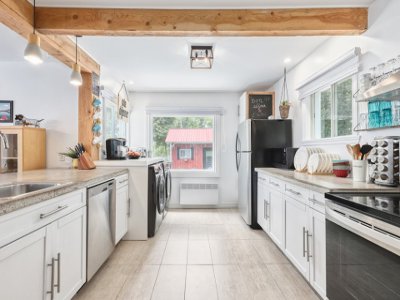 Cuisine, salle à manger, salon, salle de bain complète et chambre des maîtres.